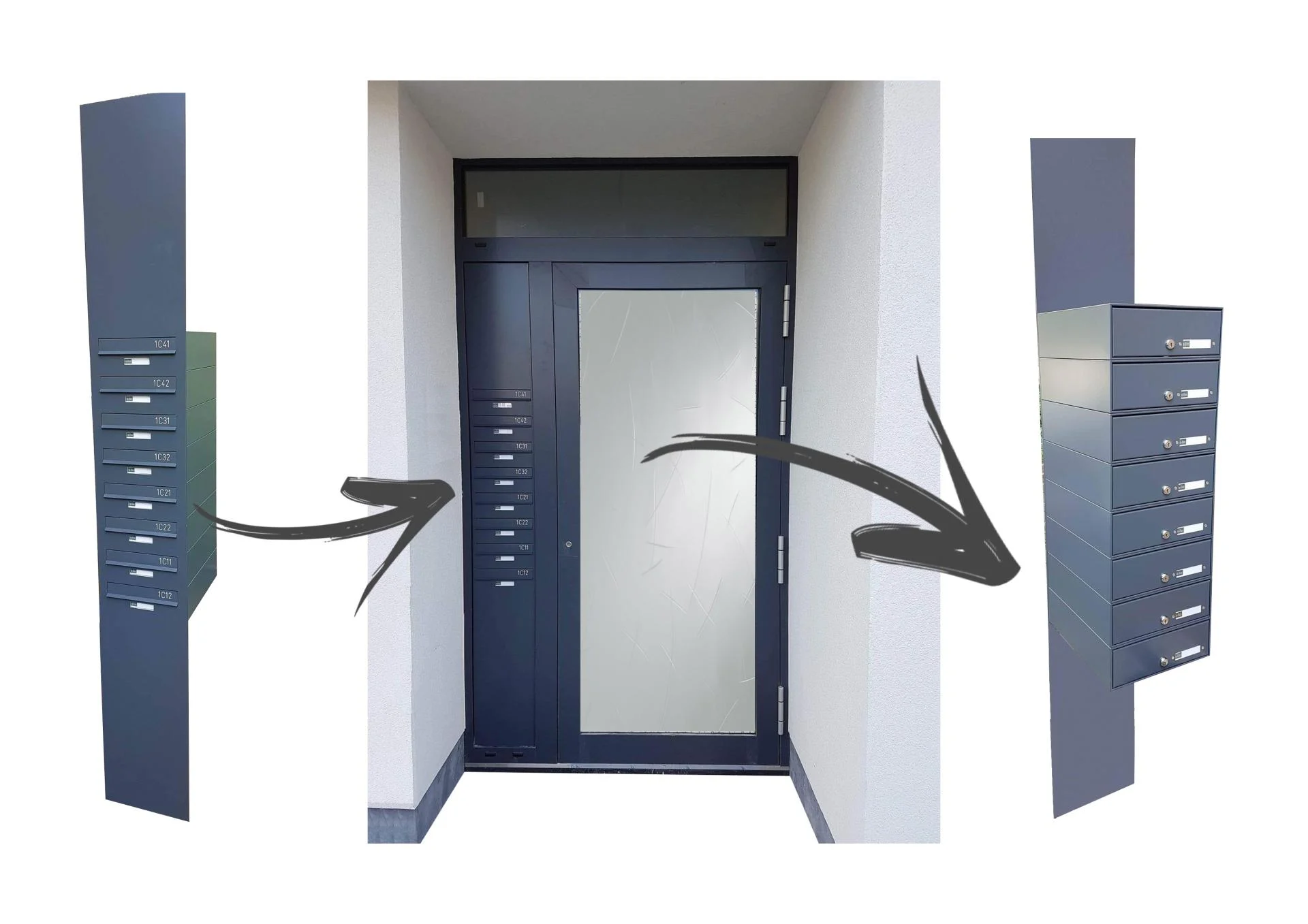 Wij bouwen onze brievenbusgehelen op maat, samengesteld volgens uw specifieke behoeften. De combinaties zijn quasi onbegrensd volgens het aantal gewenste eenheden, hetzij met identieke, hetzij met verschillende afmetingen.