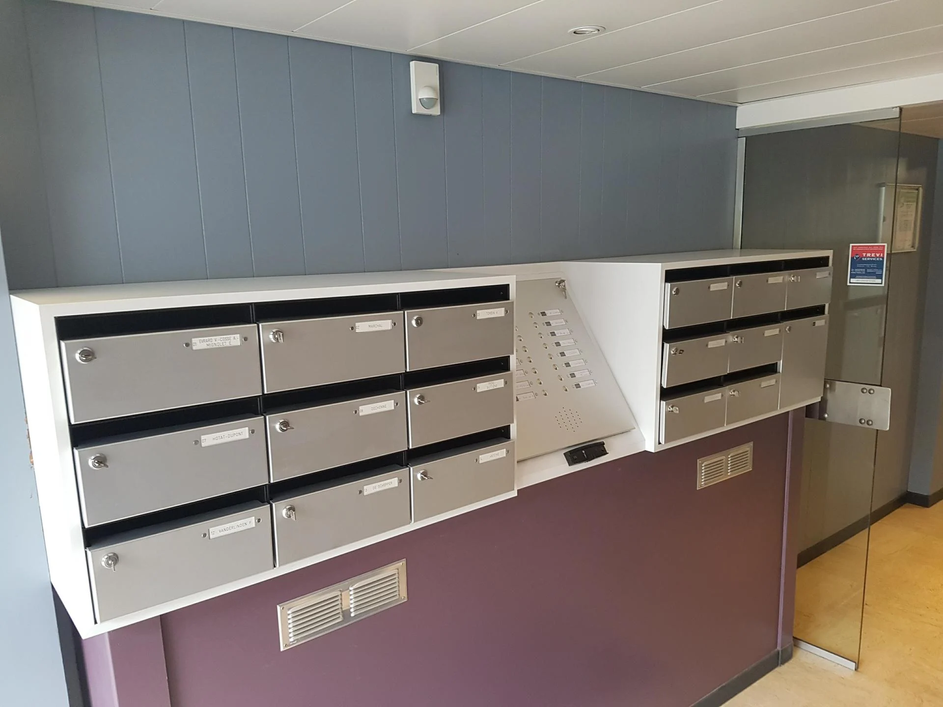 Bij de plaatsing van de modules wordt de meest geschikte oplossing gekozen, in harmonie met uw inkomhall : in opbouw tegen een muur, half verzonken of volledig verzonken ingebouwd, op een kader, …